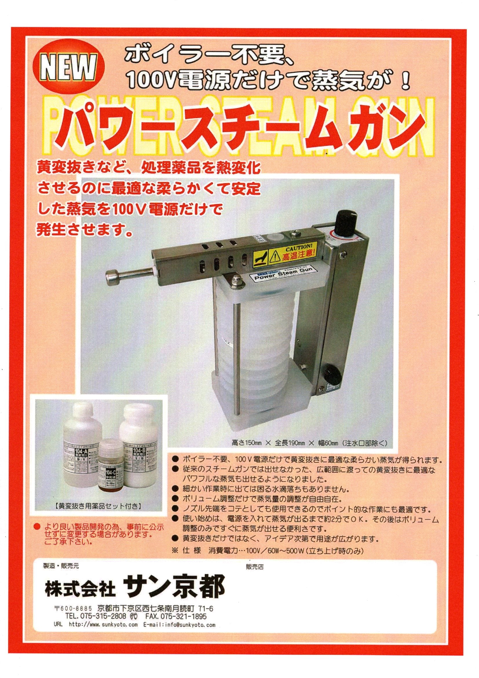 100Vの電源だけで黄変抜きや残留色素取りに最適な蒸気を発生させることができる「スチームガン」です。